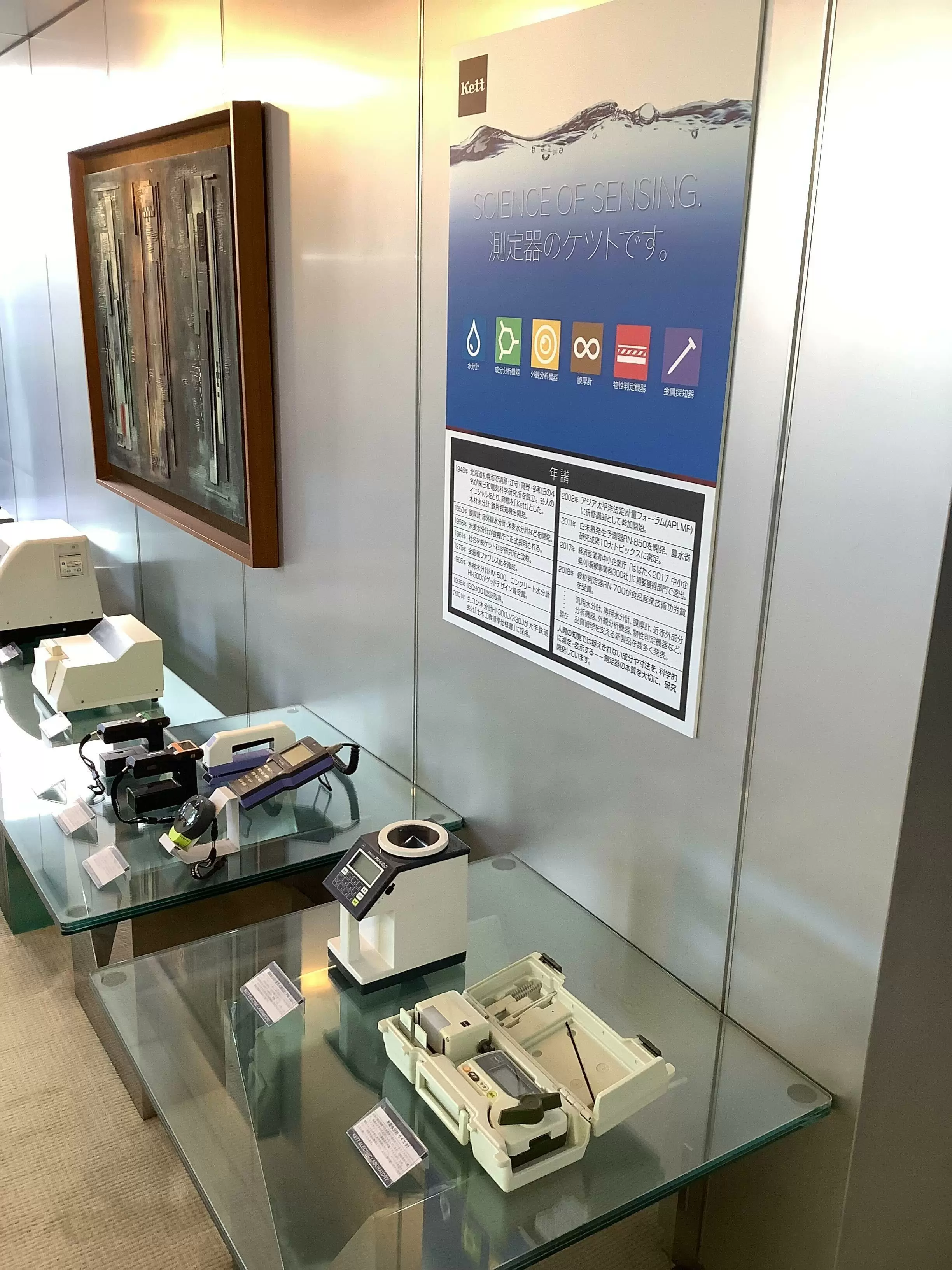 沿革 | 1946年 株式会社三和電気科学研究所設立。 創業者4名のイニシャルを取り 商標をKettとした。 木材水分計などを開発。 1956年 米麦水分計が旧食糧庁に正式採用。 1961年 社名を株式会社ケツト科学研究所と 改称。 1975年 全器種ファブレス化を達成。 1985年 木材水分計HM-500、コンクリート 水分計HI-500がグッドデザイン賞 受賞。 1998年 ISO9001認証取得。 2001年 生コン水分計HI-300J/330Jが大手鉄道 会社「土木工事標準仕様書」に採用。 2002年 アジア太平洋法定計量フォーラム (APLMF)に研修講師として参加開始。 2011年 白未熟発生予測器RN-850を開発、 農水省研究成果10大トピックスに 選定。 2017年 経済産業省中小企業庁「はばたく 中小企業/小規模事業者300社」に 需要獲得部門で選出。 2018年 穀粒判定器RN-700が食品産業技術 功労賞を受賞。 2021年 創立75周年を迎える。 |