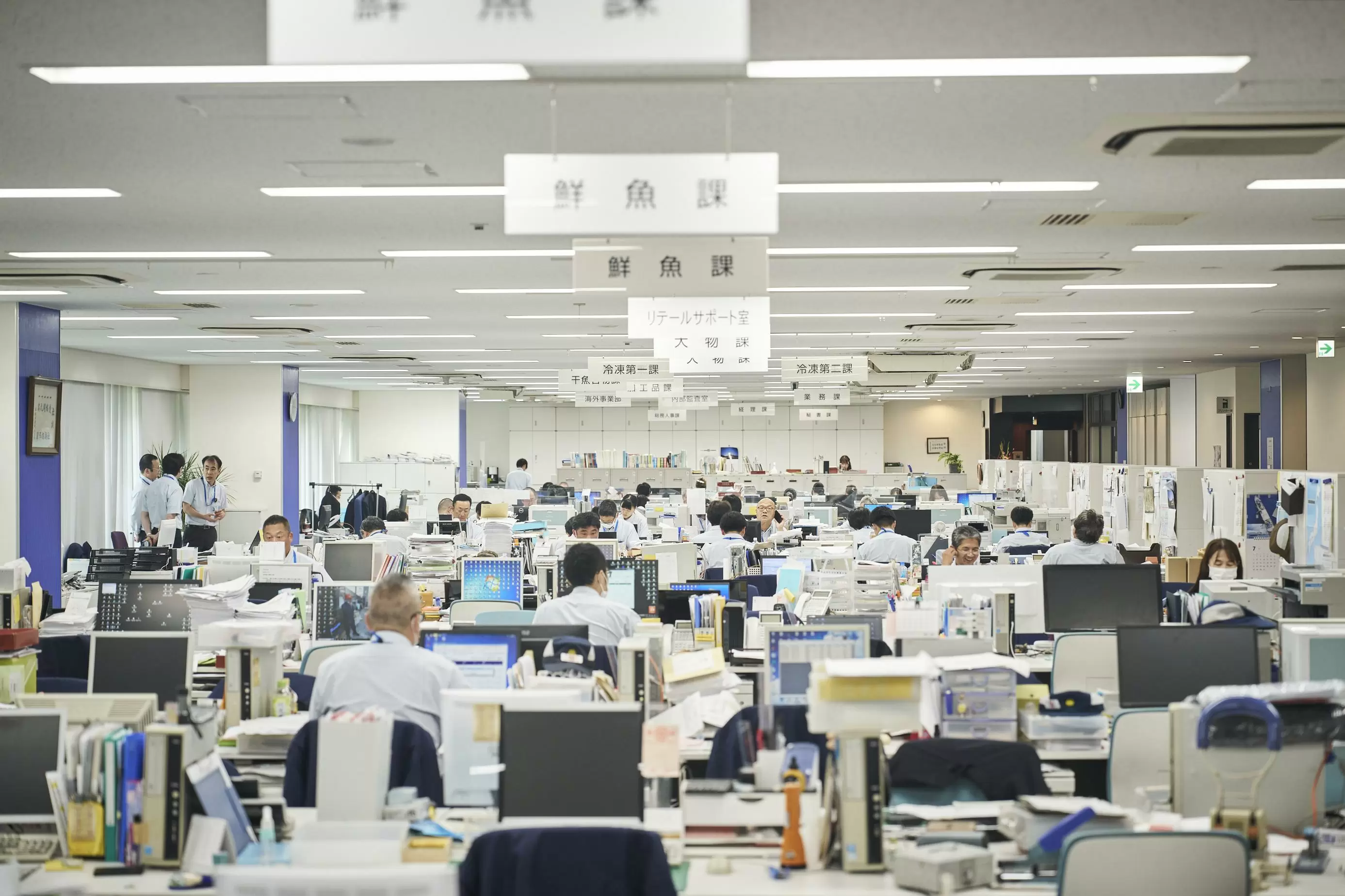 取扱品目は多種多様のあらゆる水産物で、魚種、生鮮・冷凍の違い、加工の度合い、販売先等に応じ下記の各部門が対応しています。