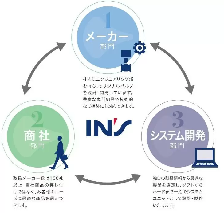 バルブを売る商社部門。バルブをつくるメーカー部門。バルブの制御システムをつくるシステム開発部門。そして、それらを支える営業事務職。各自が役割を全うし、お客様の課題を解決します。