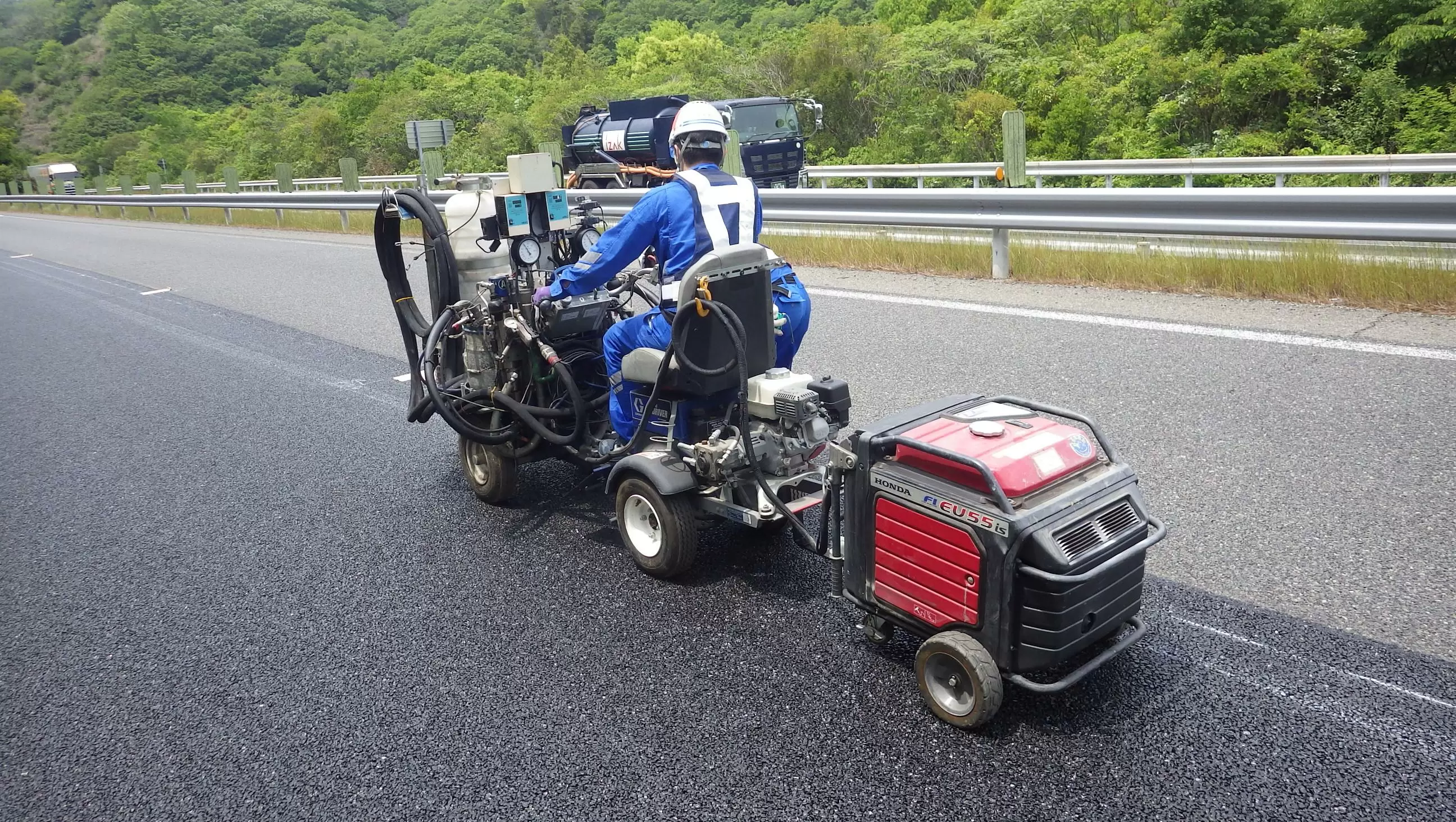 環境にやさしい新しい次世代の標示材(道路の線の材料)を作ることや、人手が足りない工事現場を助けるために、作業を自動化できる機械の研究も進めています。