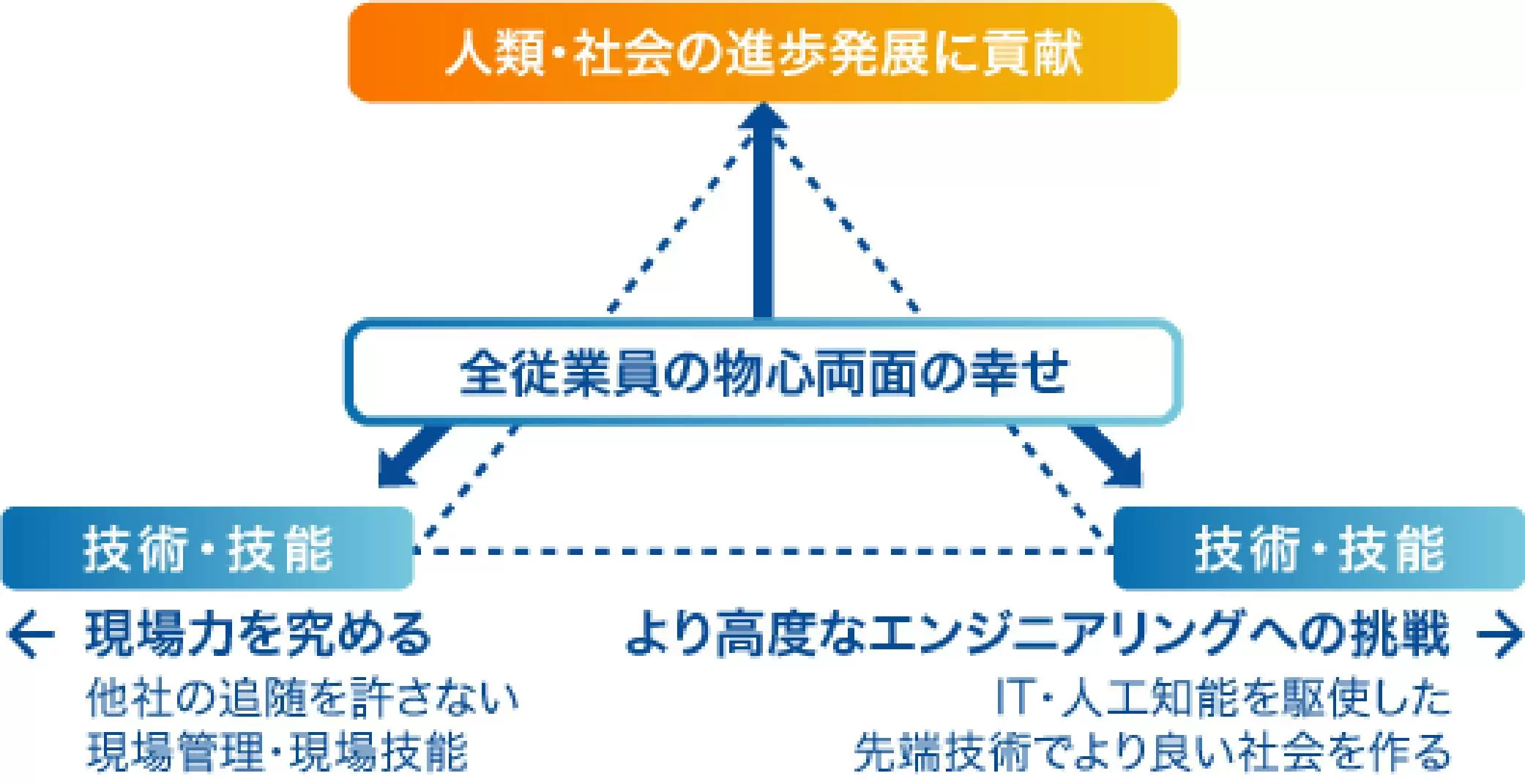 全従業員の物心両面の幸せを追求すると共に人類・社会への進歩発展に貢献する