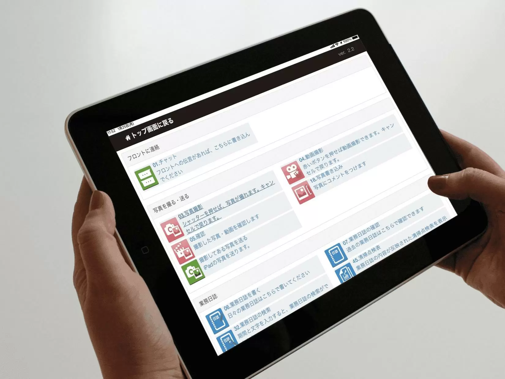 iPhoneやiPadのデバイスを各物件に配置し、老朽箇所などを画像でリアルタイムに管理員とフロント営業社員で共有しています。