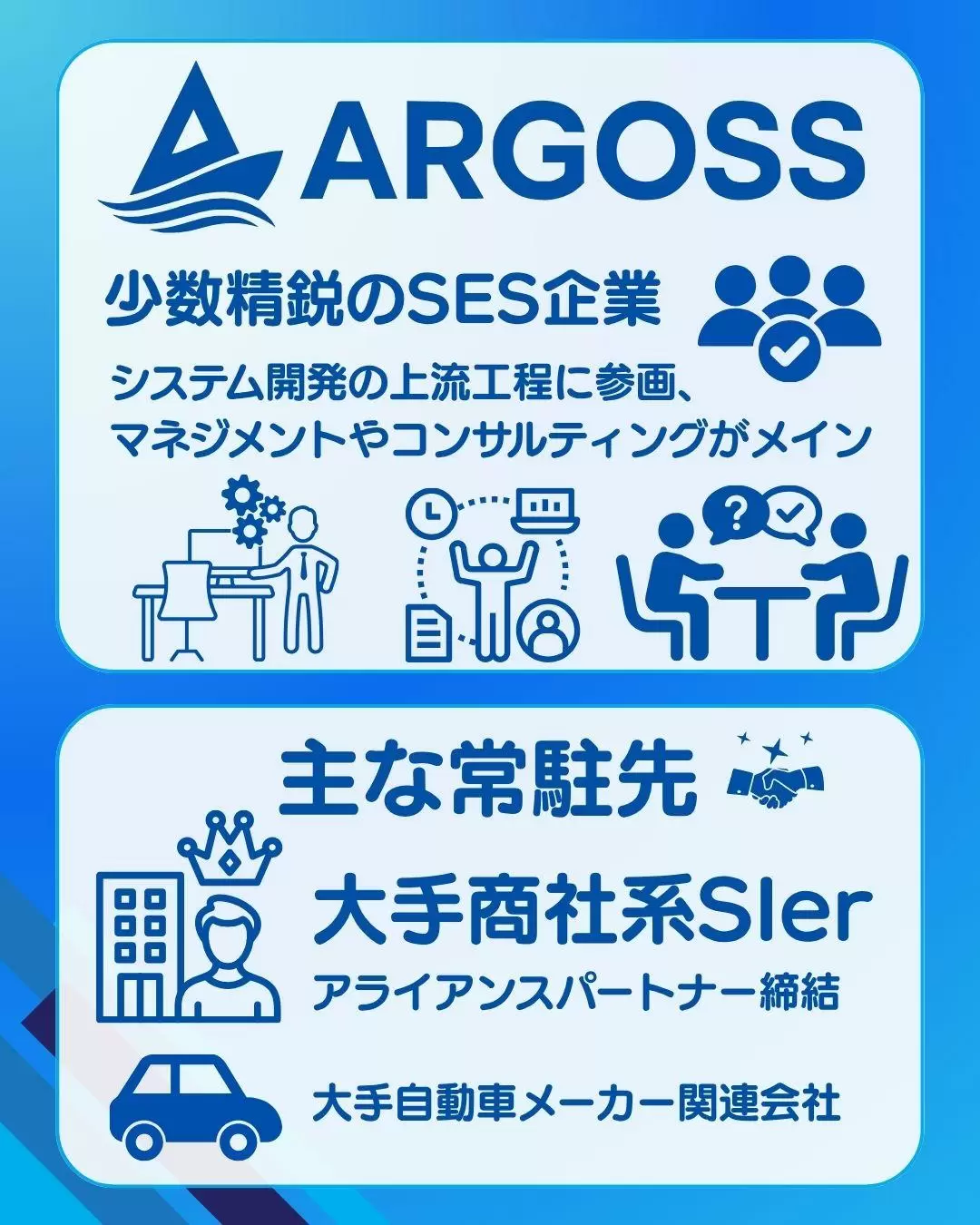 弊社は大手商社系SIerとのアライアンスパートナーを締結している、社員が20名程度の少数精鋭のSES企業となっております。