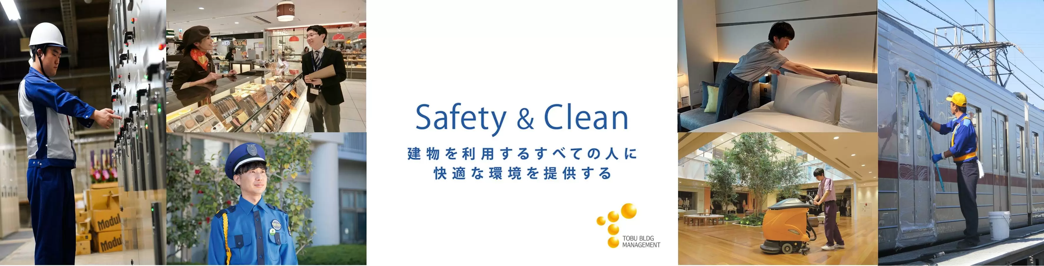 私たちの仕事は、東京スカイツリータウンといった大規模施設や、東武鉄道の特急「スペーシアX」などの清掃、駅や駅ビルの運営管理、24時間365日の警備まで、多岐にわたります。